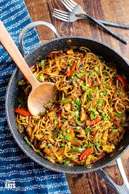 Singapore Noodles are made of rice and vermicelli style. This means they are super thin when compared to a traditional rice noodles that is usually slightly thicker. Rice Vermicelli noodles can be found at most grocery stores or at Asian markets.