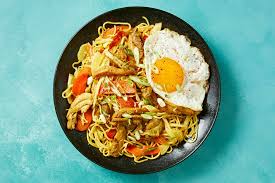 Singapore-style noodles  is a dish of stir-fried cooked rice vermicelli, curry powder, vegetables, scrambled eggs and meat, most commonly char siu pork, and/or prawn or chicken.